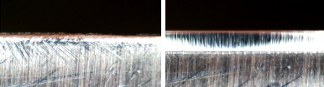 Kniven till vänster kommer endast hålla sig vass i några skär eller i några minuter. På bilden till höger är kniven grundslipad och kommer hålla sig vass i månad efter månad. Det är skillnaden mellan att underhålla- och att grundslipa.
