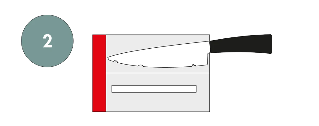 Dra bort skyddsremsan på tejpen i skyddet och fäst kniven. Viktigt att spetsen på kniven inte befinner sig i RÖTT område.